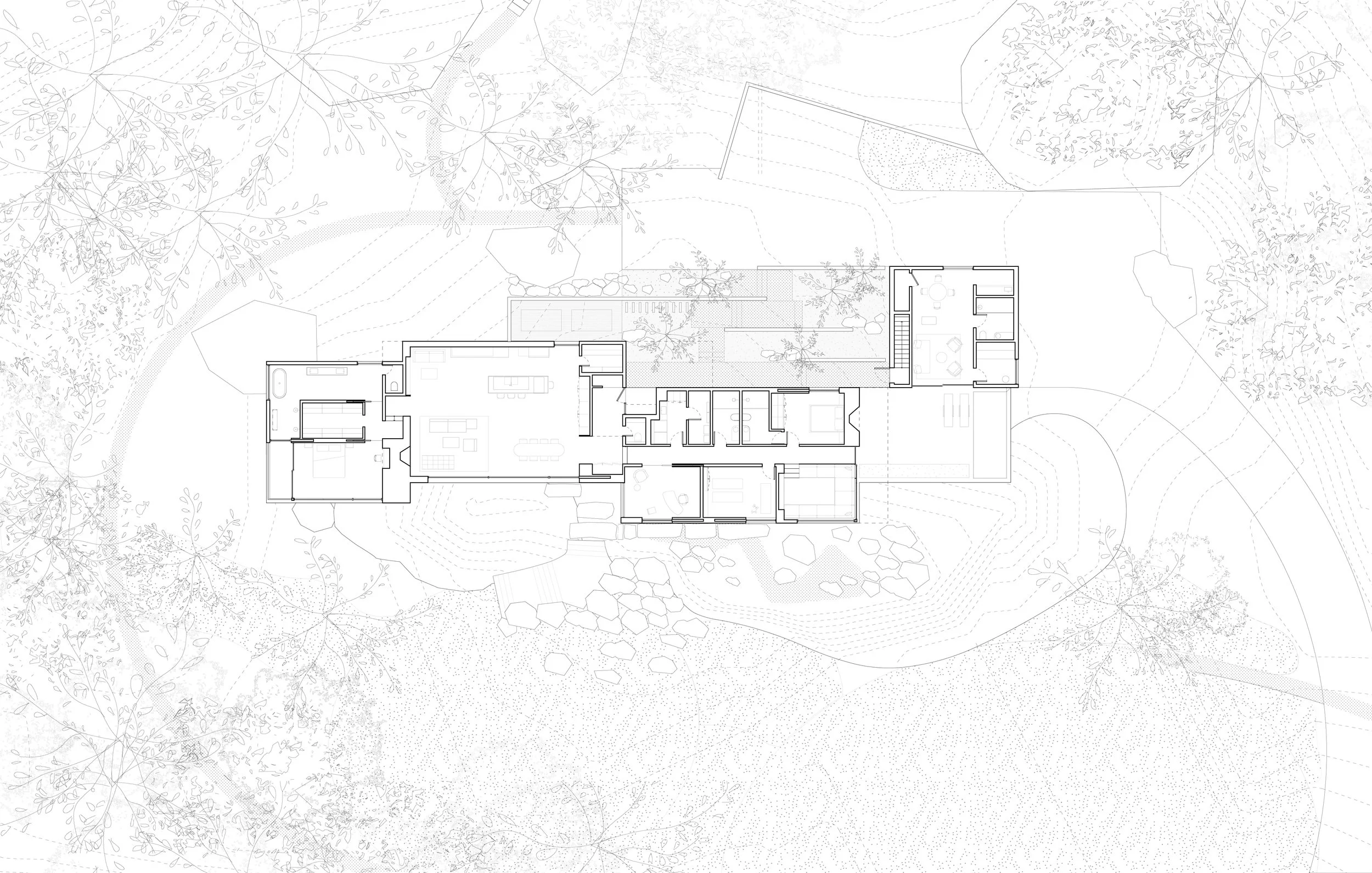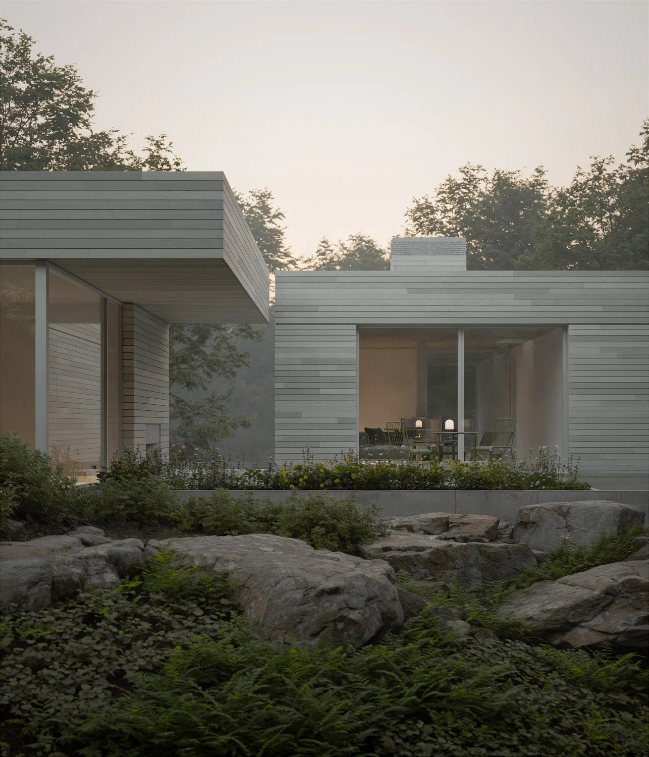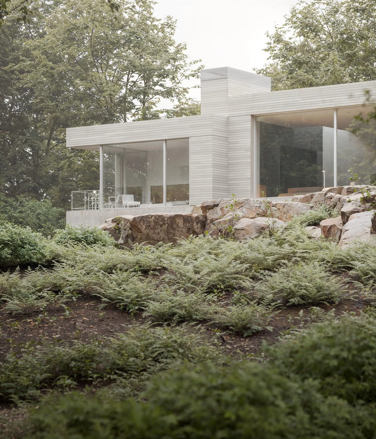 A sensitive response to a delicate terrain, Ledge House is composed of shifting, flat-roof volumes that cascade down a natural rock outcropping. The architecture steps with the steeply sloping site, preserving the natural stream, trees, and stones that weave through this protected wooded landscape in the Hudson Valley.