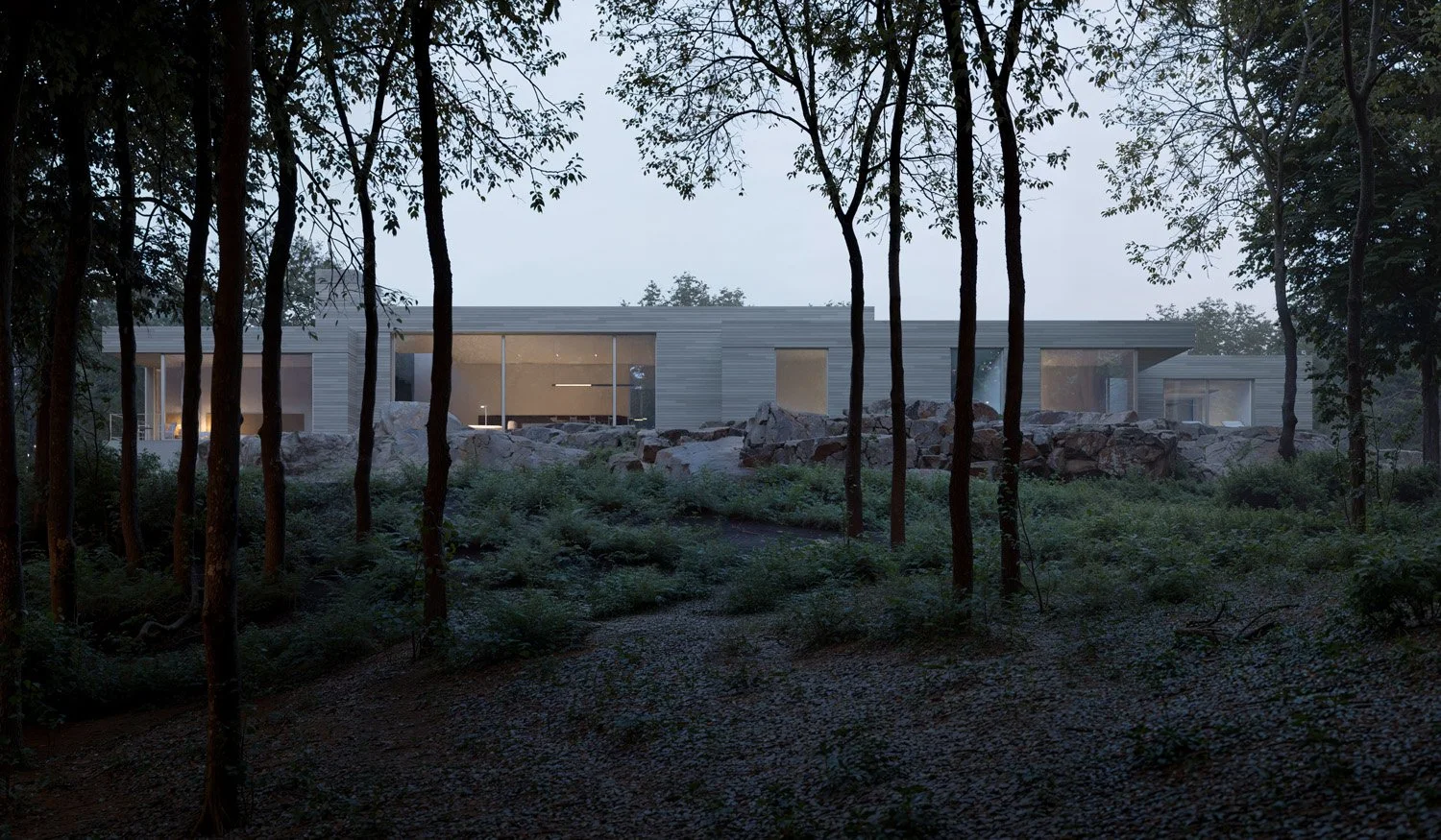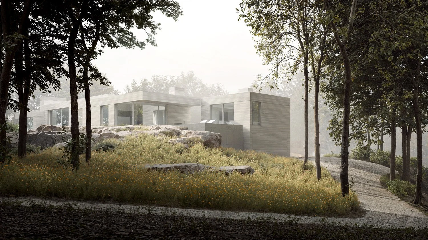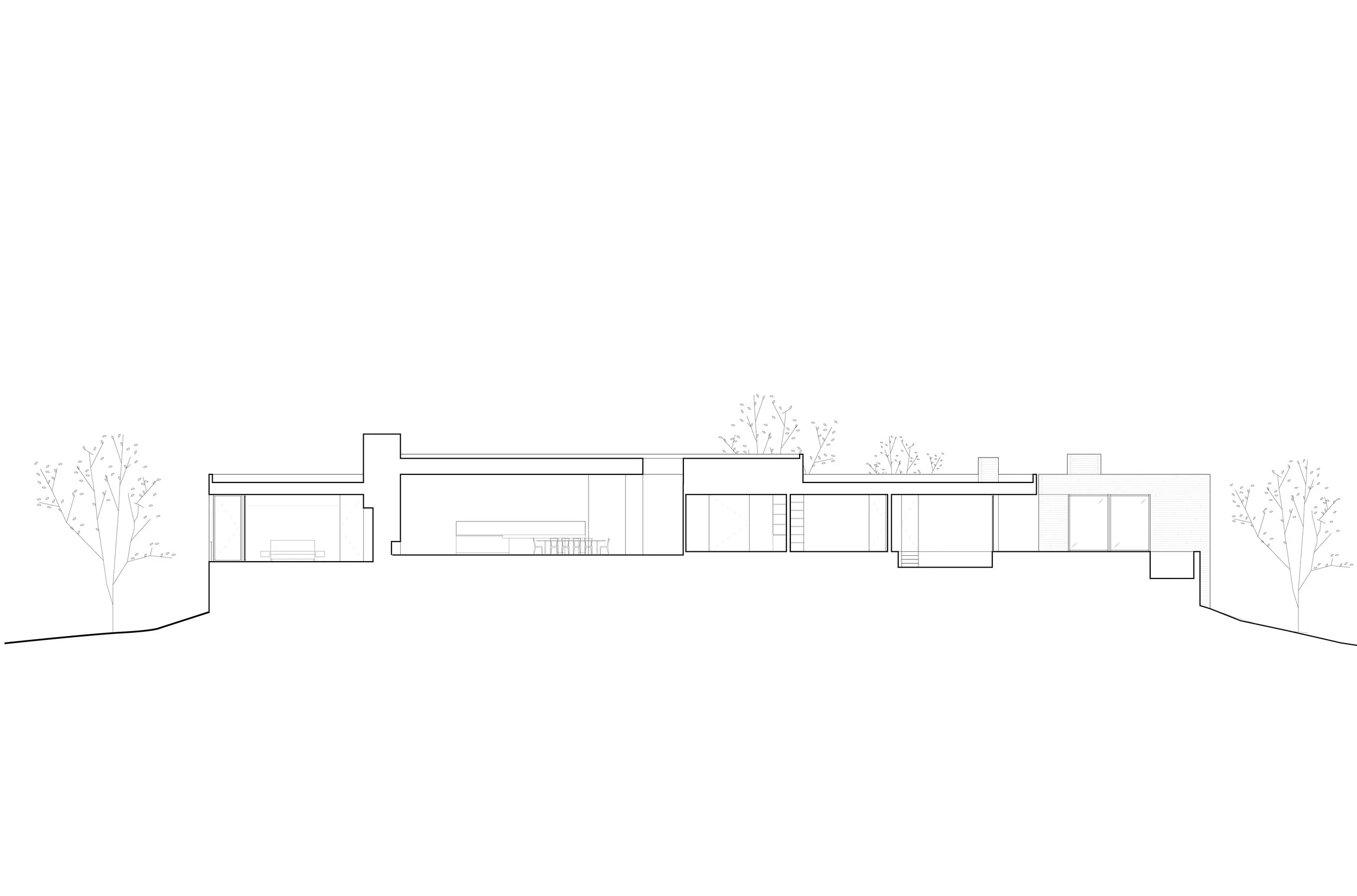 A sensitive response to a delicate terrain, Ledge House is composed of shifting, flat-roof volumes that cascade down a natural rock outcropping. The architecture steps with the steeply sloping site, preserving the natural stream, trees, and stones that weave through this protected wooded landscape in the Hudson Valley.