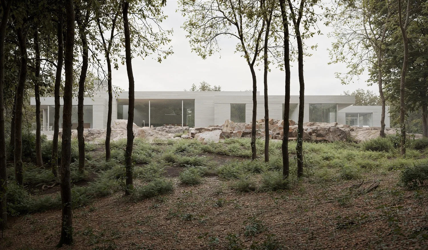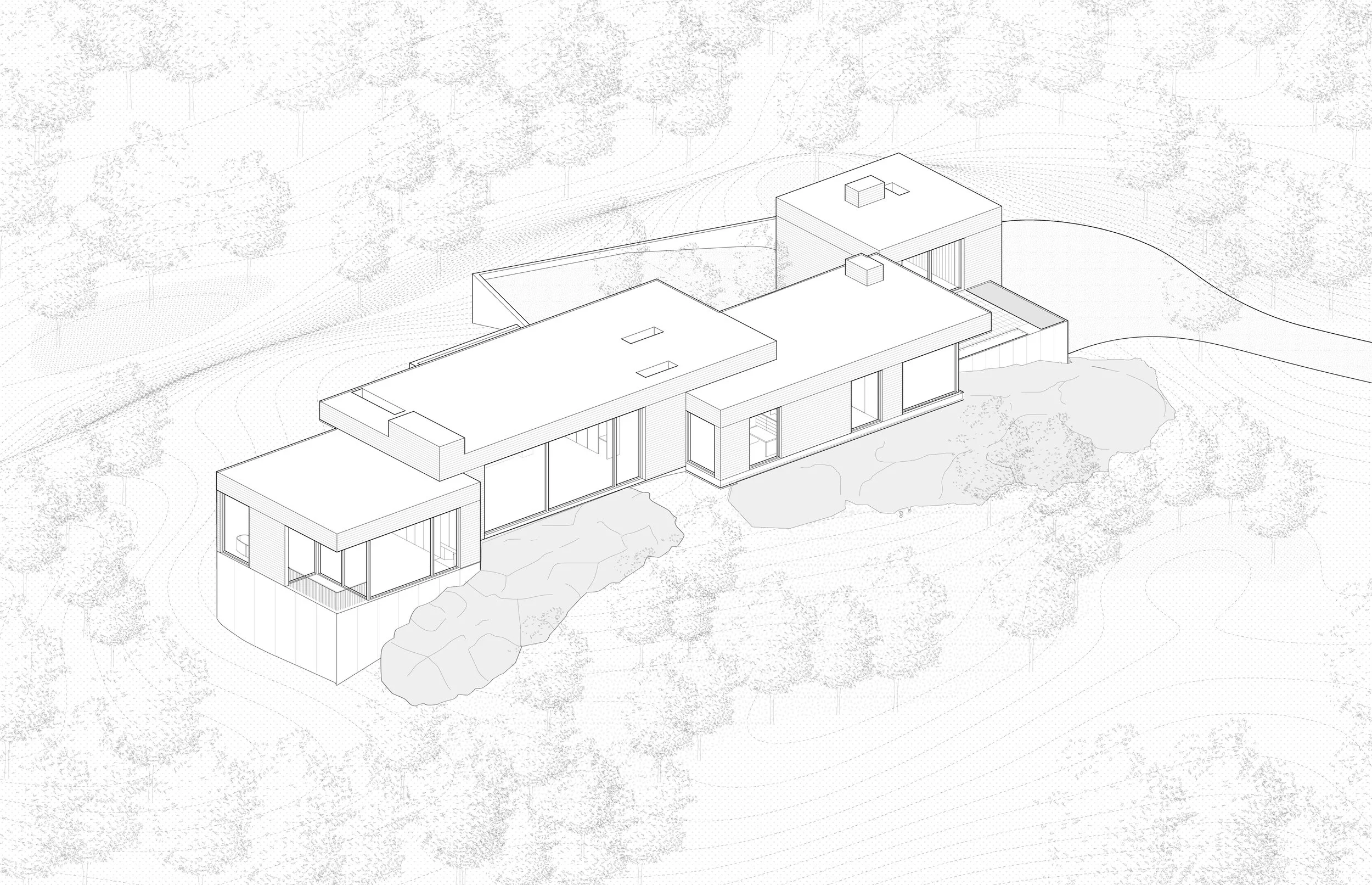 Each volume creates terraces and sheltered outdoor spaces, echoing the layered geology of the site.