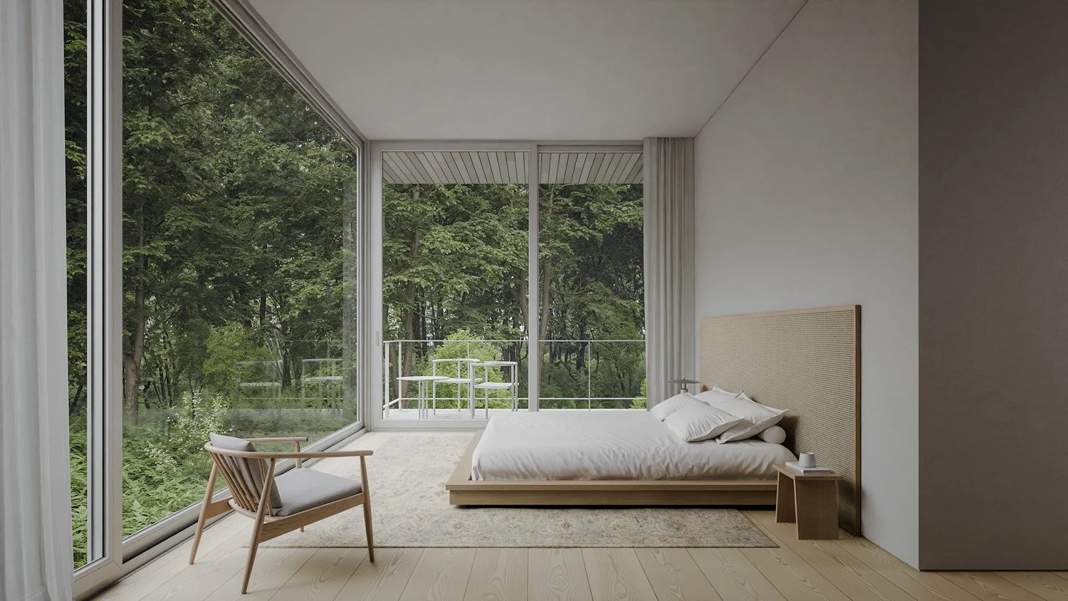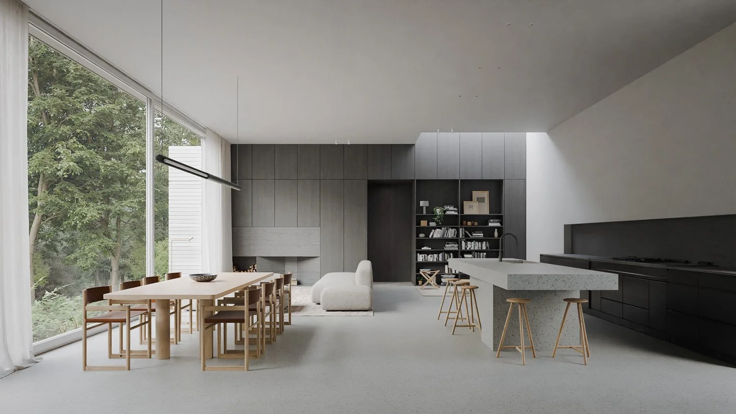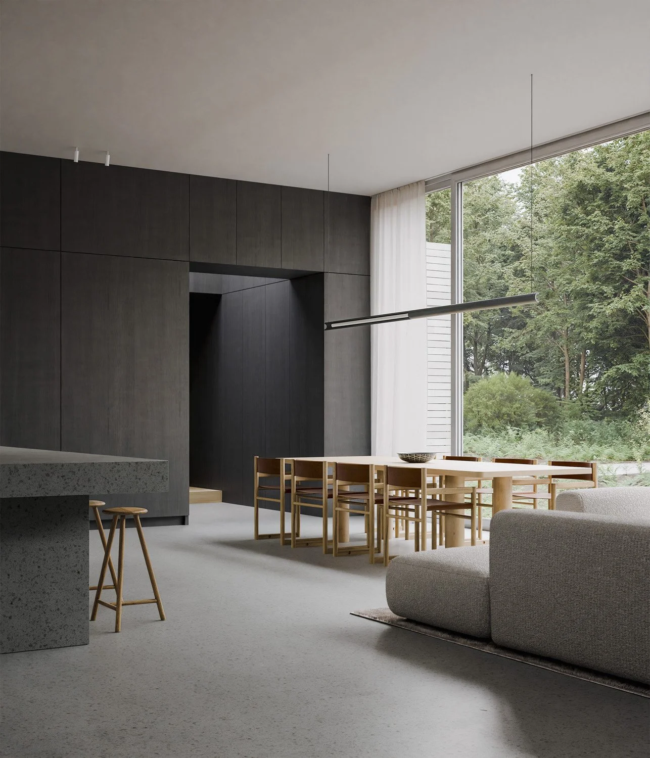 The home sits quietly within the topography, its series of flat roofs drawing horizontal lines that echo the landscape. Pale gray-stained cedar wood and large expanses of glass define the façades, blurring the boundary between the built and natural environment. Inside, swathes of floor-to-ceiling glass and dark-stained wood casework frame carefully composed views of the dramatic surroundings. These ever-changing vistas complement the restrained and neutral color palette, creating an immersive spatial experience transformed by the colors and light of the natural world.